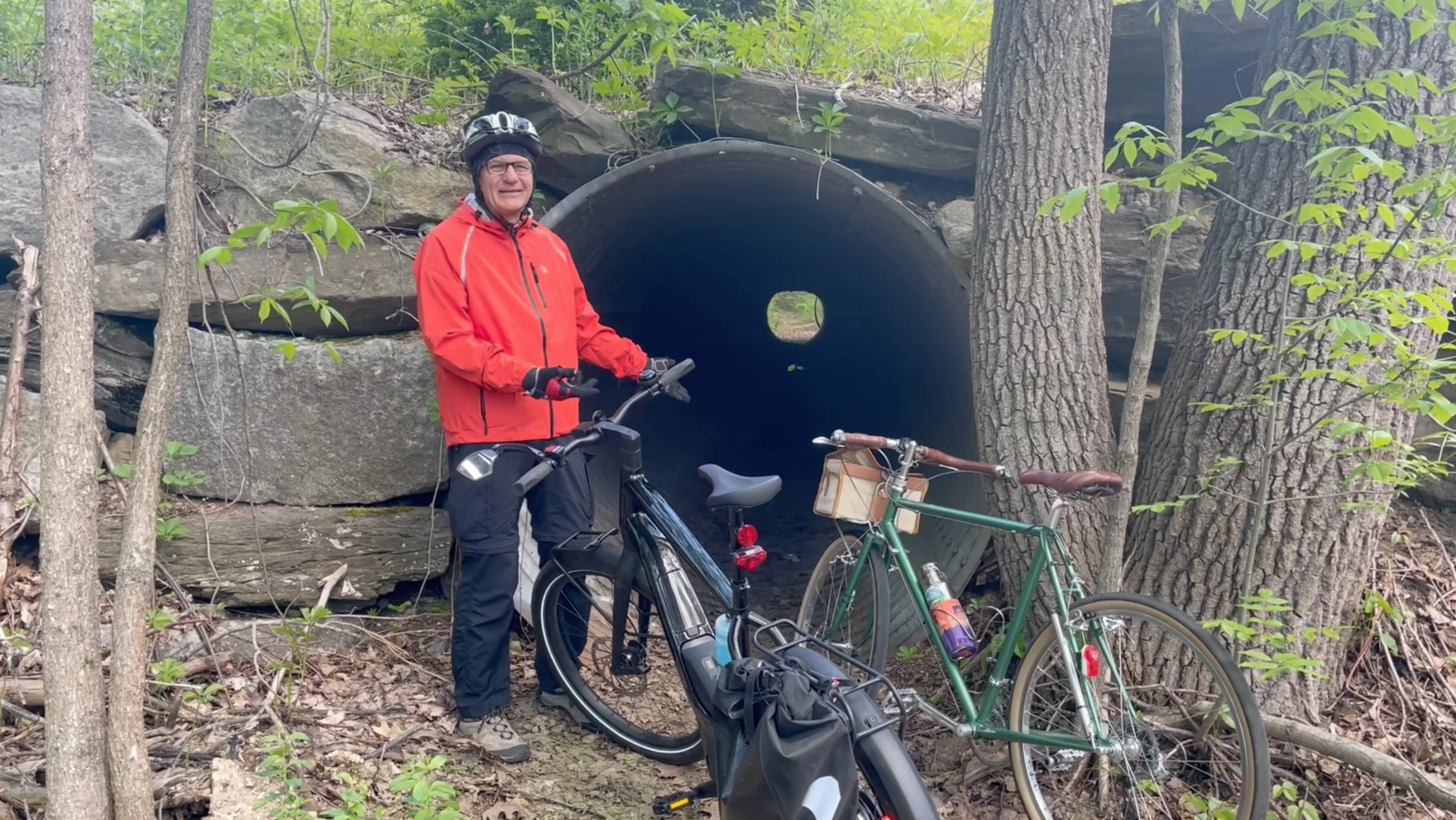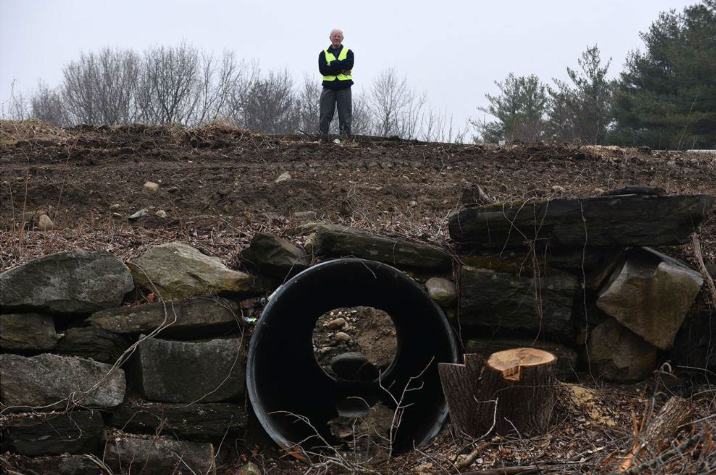 Dave Topham poses above a culvert that was going to be used for a tunnel for the Derry Rail Trail near Folsom Road in April of 2025. DAVID LANE/UNION LEADER file