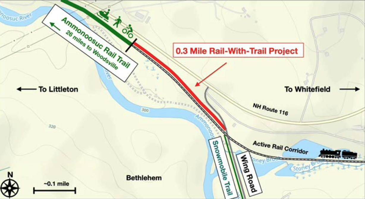 With funding from Rails to Trails Conservancy, an engineering feasibility study evaluated Rail-With-Trail options along a short but critical 0.3-mile section of rail corridor in Bethlehem, NH, part of the Ammonoosuc Rail Trail eastward extension projects. The study outlines practical alternatives for accommodating both trail users and an active rail line, plus provides information on this process for other rail trail organizations to utilize.